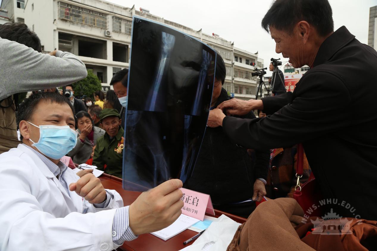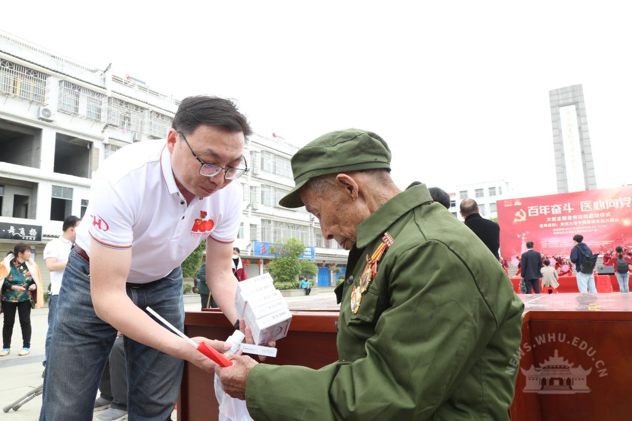 上午10点,义诊正式开始,武汉大学中南医院17位党员医生联合当地医疗团队,为七里坪镇的乡亲们义诊,并带来了价值数万元的免费药品发放给到场患者。武汉一家慈善机构也为需要帮扶的老军人及家属们捐赠30万元专项扶助基金。