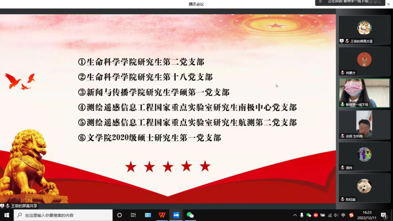党的十九大报告提出了“培养担当民族复兴大任的时代新人”的战略,为进一步推动培育担当民族复兴大任的时代新人任务,2022年12月11日,由武汉大学“薪火相传”导学相长工作室,武汉大学生命科学学院承办的“‘薪火相传’研究生党支部育时代新人计划主题论坛”在武汉大学生命科学学院隆重举行。生命科学学院研究生第二党支部受邀参加此次论坛,此外还有生命科学学院研究生第十八党支部、新闻与传播学院研究生学硕第一党支部、测绘遥感信息工程国家重点实验室研究生南极中心党支部、测绘遥感信息工程国家重点实验室研究生航测第二党支部和文学院 2020 级硕士研究生第一党支部共6个优秀学生党支部的100多名研究生党员代表参与此次论坛,生命科学学院学生工作办公室主任余丽老师出席本次论坛。