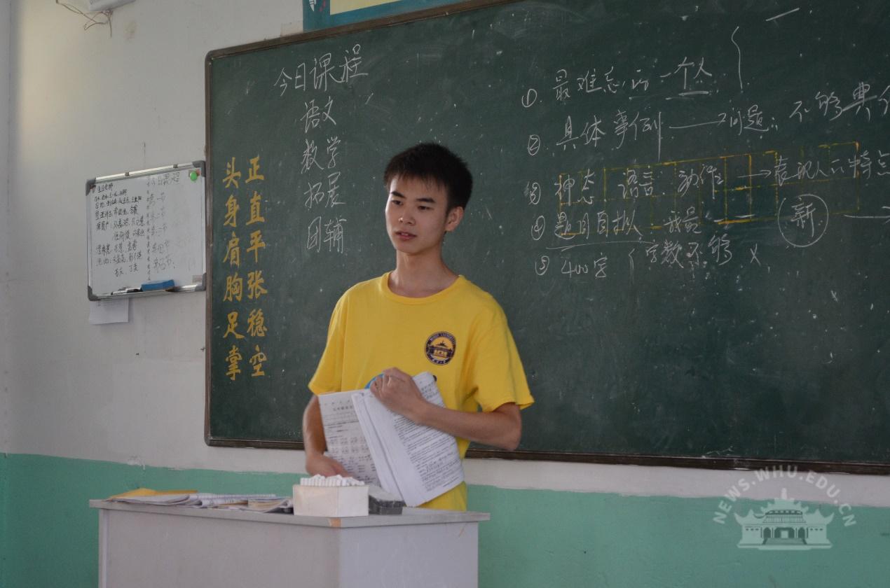 作为一名从国家级贫困县农村走出来的学生,党和国家的关怀让他常怀感恩,坚定为他人服务的初心,本科毕业后他毅然加入武汉大学研究生支教团,前往国家脱贫攻坚主战场参与教育扶贫,站好三尺讲台,传播知识。他担任脱贫攻坚夜校讲师,带领团队累计培训当地村民800余人次,荣获全国大学生志愿服务西部计划考核等次优秀志愿者。他积极参与各项赛事,曾获“互联网+”大学生创新创业大赛全国铜奖、湖北金奖,志愿服务项目大赛全国银奖,挑战杯湖北银奖等荣誉,入选全国青马工程高校班学习。
