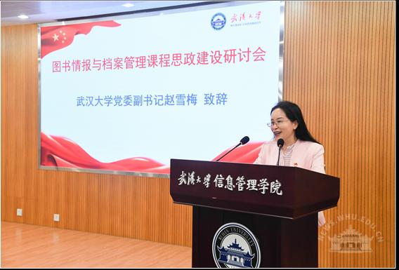 校党委副书记赵雪梅出席开幕式并致辞。她介绍了武汉大学课程思政建设的基本情况,希望兄弟高校共同建设图书情报与档案管理学科的教师队伍主力军、课程建设主战场、课程教学主渠道,完成好为党育人、为国育才的光荣使命。
