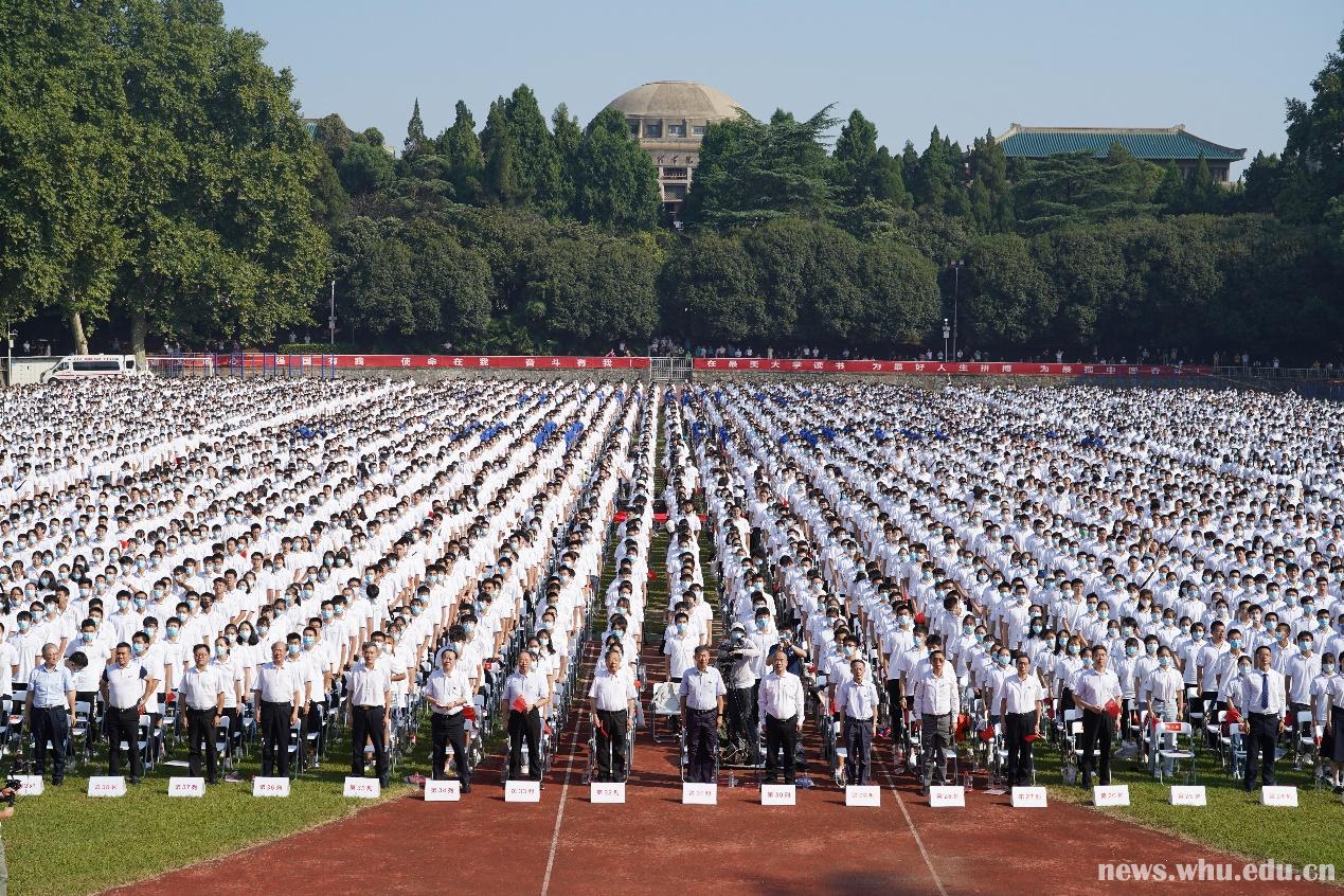 这是一场穿越时空的开学典礼,也是一场意义非凡的开学典礼。今年是中国共产党百年华诞,也是“两个一百年”奋斗目标的历史交汇点。63年前的今天,毛泽东主席在武汉大学行政楼前的操场上,亲切接见武汉大学学生,这里因此被命名为九一二操场。今天,本科新生开学典礼在此举行,寄寓武大学子对武大精神与历史使命产生更深刻的理解。