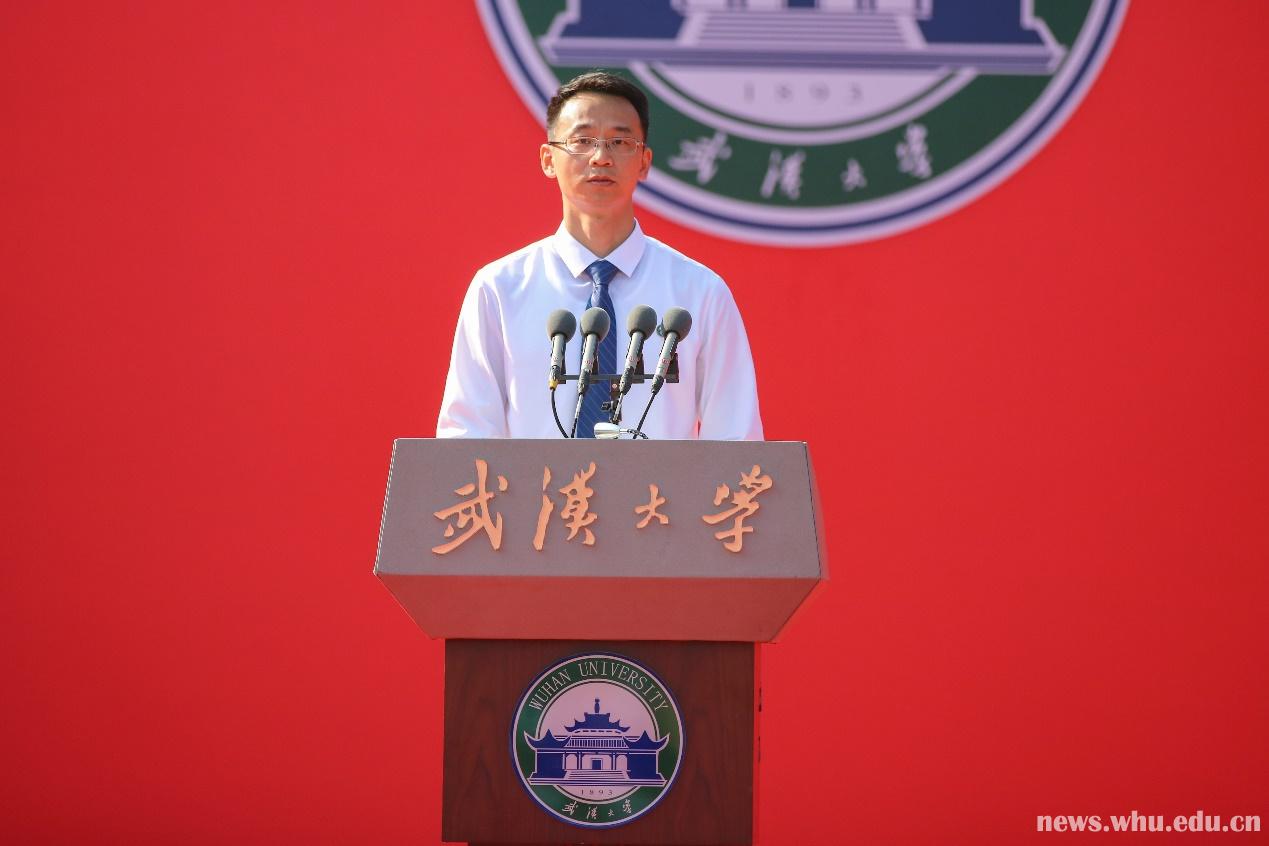 教师代表、物理科学与技术学院肖湘衡教授,在武汉大学求学、成才、成家、立业,是一位有着24年武大经历的珞珈山“资深山民”。他向萌新们介绍了自己心中的珞珈山:一座“大师之山”,秉承一代又一代珞珈山学人积淀,今天的我们才能在光风霁月中砥砺前行;一座“人文之山”,珞珈山培养的学生从来不只是为了个人的谋生,她塑造的是“文化的人”,而非“工具的人”;一座“精神之山”,珞珈山下一段青春,强国路上一生奋斗,便是珞珈精神的深切蕴含。