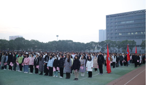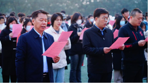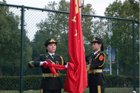 迎着清晨第一缕阳光,在雄壮庄严的国歌声中鲜艳的五星红旗冉冉升起,全体师生肃然静立、凝眸注视、共唱国歌。