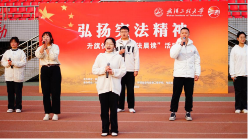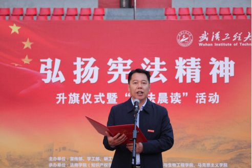为深入学习贯彻党的二十大精神,贯彻落实习近平法治思想和习近平总书记关于宪法的重要论述精神,培养师生崇尚宪法、尊重宪法、服从宪法、遵守宪法的意识,推动学校教育事业高质量发展和法治校园建设,2023年12月4日,正值第十个国家宪法日之际,学校在流芳校区标准体育场举行“弘扬宪法精神”升旗仪式暨“宪法晨读”活动。校党委常委韩高军、环境生态与生物工程学院党委书记孔海霞、校党委宣传部副部长赵小硕、校团委副书记邓欢出席升旗仪式,相关学院领导班子成员、全体辅导员、教师代表、学生代表参加活动。活动由宣传部、学工部、研工部、校团委主办,法商学院(知识产权学院)、管理学院、环境生态与生物工程学院、马克思主义学院联合承办。