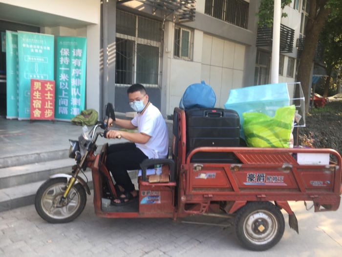 8月27日下午2点,我院车辆专业学生从五号楼搬至八号楼(学校寝室调整的第一批队伍,其搬出之后,第二批进驻第一批的原寝室),学院设置了党员服务岗,党总支秘书汤雁、学工口老师及学生党员成立党员先锋队,协助学生搬运,留校工作的车辆专业辅导员周立华开三轮车为学生搬运了近二十车行李,高效平稳完成学校第一批寝室搬迁。