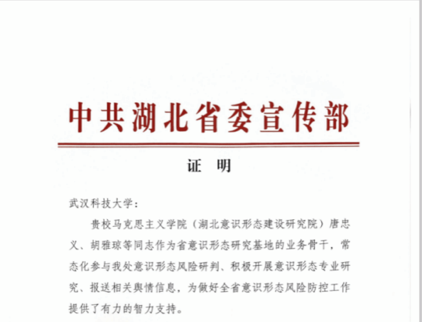 湖北意识形态建设研究院是中共湖北省委宣传部直接领导、我校为建设主体的省级智库,是全国第一家以“意识形态”冠名的省级专业研究机构和智库。研究院坚持开放办院,立足湖北、面向全国,聚焦意识形态建设重大理论和实践问题,在加强理论研究的同时,为中央部委、省委、省政府和相关部门提供智力支持。支部成员唐忠义任研究院院长,支部成员刘勇、王晓曦任研究院副院长,多名教师承担了相关工作。