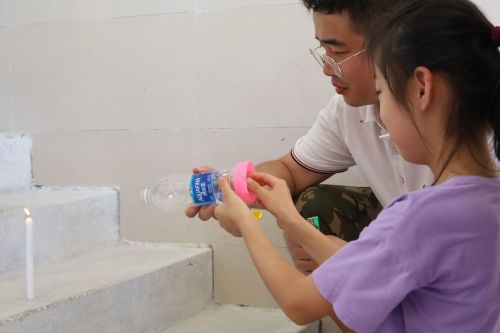 7月27日下午,材料学院学生社团党支部成晓雷、王聪带领小朋友们动手制作“空气炮”,实验原理是基于前一天上课所教授的大气压相关知识点,实验器材由生活中常见的物品例如塑料瓶、气球、蜡烛等构成。在老师进行详细的讲解后,小朋友们在老师的帮助下按照刚才演示的步骤一步步有条不紊的完成实验用具制作并排队进行实验。起初,排在前面的同学实验进行的并不顺利,蜡烛的火焰即使被“空气弹”打中却并未熄灭,后面的同学仔细观察并对前面同学的失败经验进行总结,随着时间的推移,实验进行的愈来愈顺利,直至最后一位同学全部完成。