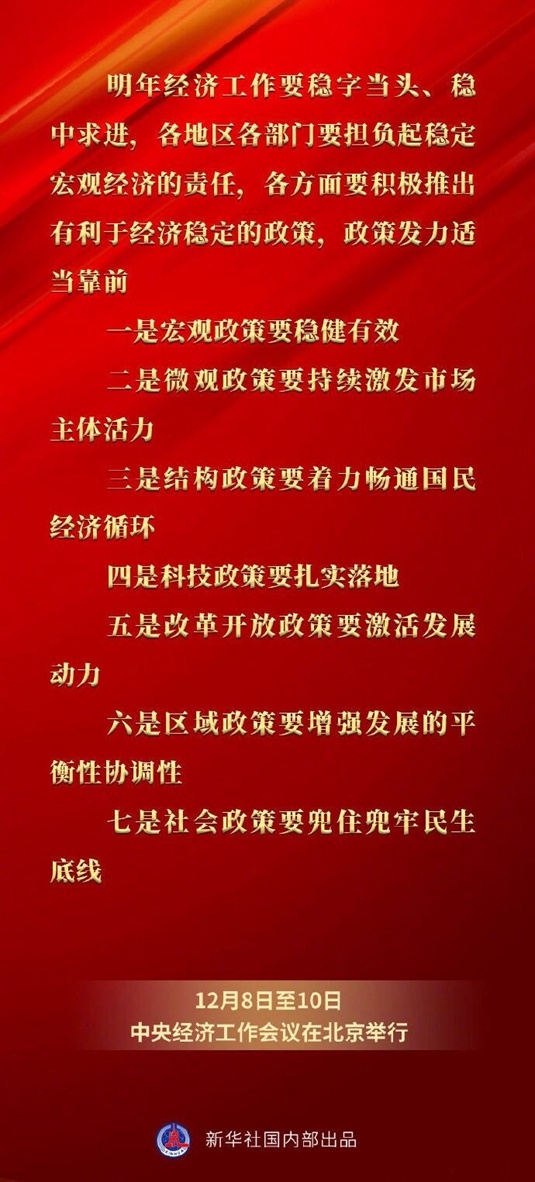 会议要求,明年经济工作要稳字当头、稳中求进,各地区各部门要担负起稳定宏观经济的责任,各方面要积极推出有利于经济稳定的政策,政策发力适当靠前。