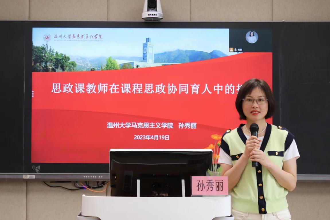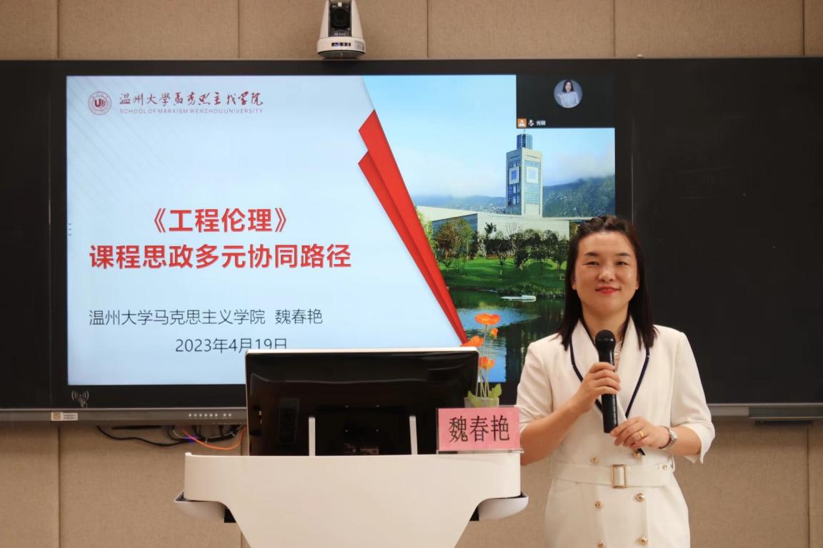 4月19日下午,温州大学高校课程思政和思政课程协同育人沙龙活动,在北校区信息楼A307顺利进行。本次活动由温州大学教务处、马克思主义学院、全国高校名师工作室(温州大学)主办,温州大学教发中心、高校课程思政协同育人课题组、《工程伦理》课程思政多元协同建设研究课题组承办。中央财经大学冯秀军教授、温州大学马克思主义学院衡孝庆、何玲、孙秀丽和魏春艳老师做主题发言。温州大学马克思主义学院党委副书记、院长卓高生出席本次活动并致辞。沙龙由马克思主义学院教工第一党支部书记项淳芳主持,来自全校的50多位教师参加学习。