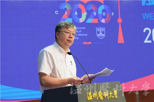 2020年7月1日上午,学校在茶山校区旭光厅举行温州医科大学2020届学生第二场毕业典礼,欢送1023名研究生、2880名本专科毕业生踏上新征程。校领导吕帆、李校堃、吕一军、程锦国、王良兴、曹建明、陈培根、金胜威、吕文革、汪军洪、张华杰出席典礼,学校相关部门、学院负责人,教师代表、毕业生代表参加线下典礼,因疫情防控需要,更多的毕业生和家长们通过参与线上直播的方式,共同见证这一庄严时刻。典礼由副校长曹建明主持。