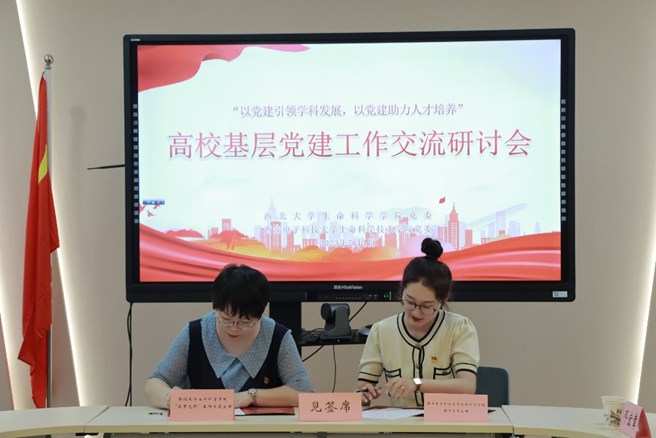 随后,西安电子科技大学生命科学技术学院本科生党支部与西北大学全国样板支部“筑梦先锋”本科生党支部签订支部共建协议及共建揭牌仪式,旨在搭建党支部共建平台,建立共建联系,激发基层党组织建设的新活力。共建双方分别从支部建设的基本情况、支部建设的工作经验以及支部内党员的先锋模范作用发挥等方面进行了深入探讨交流,西北大学生命科学学院本科生党支部书记常雅慧详细介绍了“筑梦先锋”本科生党支部的培育建设情况及特色做法经验,西安电子科技大学生命科学技术学院本科生党支部书记王琦琍从支部架构、支部管理办法、支部活动等多个方面分享了支部建设成果,共建双方就如何更好的服务师生、提升基层党组织的创造力、凝聚力和战斗力等方面提出了共建内容,双方一致认为,要坚持以党建引领学术攀登,服务国家重大需求,守正创新,将论文写在祖国大地上;要深入学习贯彻习近平新时代中国特色社会主义思想和党的二十大精神,积极落实新时代党建的新要求,坚定信心,砥砺前行,推动基层党建工作向纵深发展,为生命健康的发展谱写出更加辉煌的篇章。