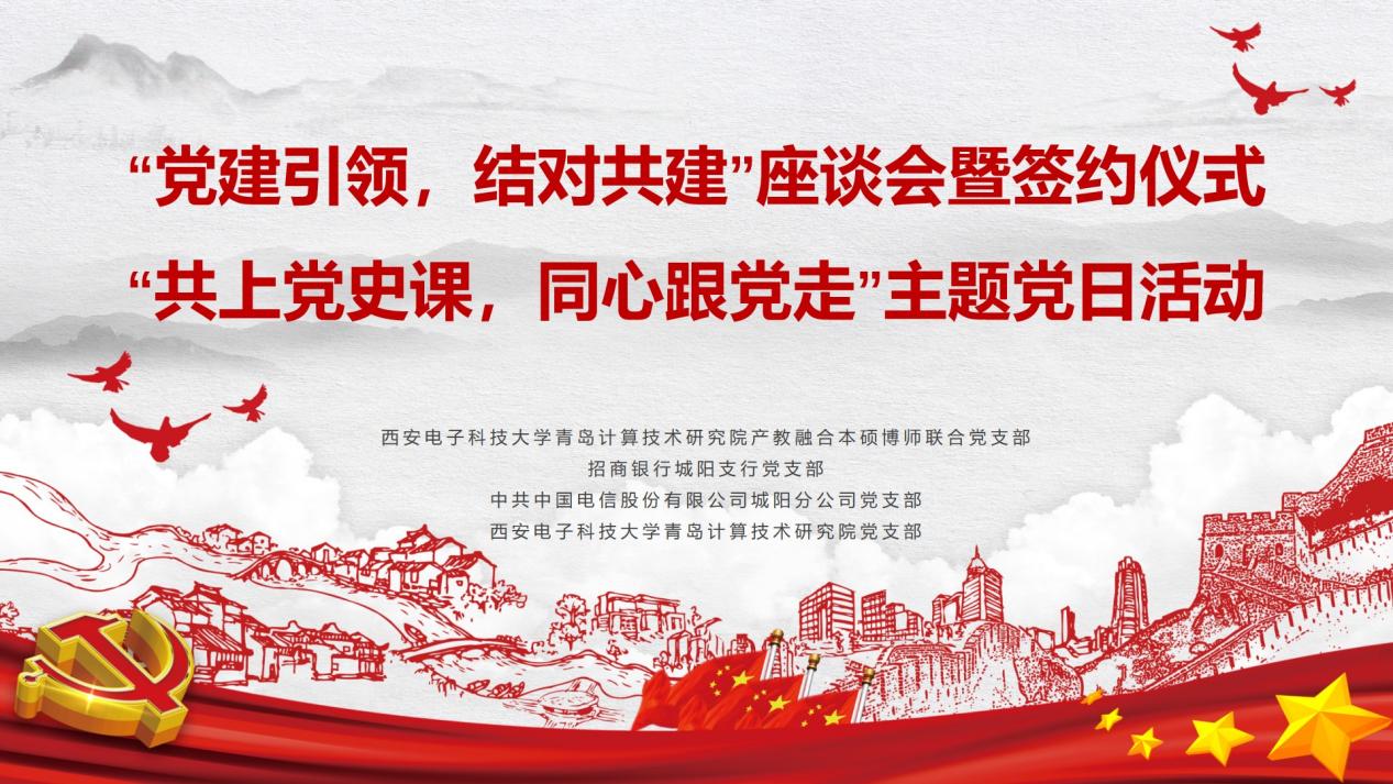 为认真学习贯彻习近平总书记在党史学习教育动员大会上的重要讲话精神,按照校院两级党史学习教育相关方案要求,西安电子科技大学计算机科学与技术学院党委提前谋划,西电青岛计算技术研究院产教融合本硕博师联合党支部主动对接,与西电青岛计算技术研究院党支部、招商银行城阳支行党支部、中共中国电信股份有限公司城阳分公司党支部结对共建。西电计科院党委书记李青山、党委副书记张莹莹等一行5人赴西电青岛计算技术研究院参加了结对共建活动。