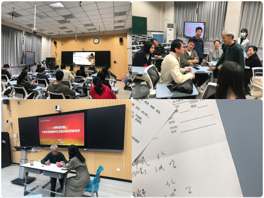 27日下午,西安国际医学中心段兴州教授作《中医药文化系列讲座之一—四诊》主题报告。段教授从“望、闻、听、切”四诊法讲述中医的纲领,以面部色泽、口唇舌貌、言语呼吸、体表饮食等日常身体表征对应中医基本诊疗理论,分析不同表征预示的疾病可能,帮助教职工用简单方式预判身体状况。报告过程中设置互动环节,氛围生动积极。报告结束后,段教授对所有参加活动的教职工进行长达2个半小时的把脉问诊,根据教职工身体状况,为每位教职工开具调理处方,深受教职工夸赞。