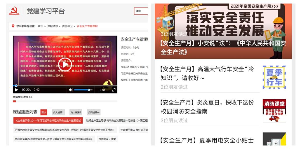 在线上,保卫处在学校党建学习平台上线“安全生产”专题公开课,各单位也通过微信公众平台、QQ群、微信群等渠道,对《安全生产法》、消防安全、用电安全、夏季行车安全等知识进行科普宣讲。