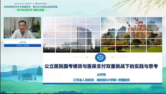 占伊扬副院长以《公立医院国考绩效与医保支付双重挑战下的实践与思考》为题,讲解医保支付方式改革背景、国家公立医院绩效考核的核心内容。他以江苏省人民医院为例,介绍了医院医保管理的实践,包括体系建设、加强联动、加强宣传、建章立制等方面。特别是以DRG思路和绩效考核思路应用于医保管理的内容令人印象深刻。