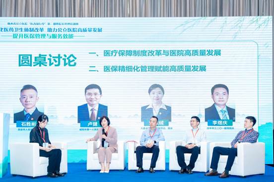 随后的圆桌讨论环节,特邀陕西省卫生健康委员会体制改革处马兰副处长主持,有代表性的地市级医院院长上台,就“医疗保障制度改革与医院高质量发展”和“医保精细化管理赋能高质量发展”两个主题展开交流。参与讨论的西安市人民医院院长石胜彬、咸阳市第一人民医院院长卢健、大荔县医院院长史慧绒、汉中市三二〇一医院院长李煜庆,分别从培训会议学习体会、各家医院管理实际出发,分享了对医保改革的认识及医院在医保管理的实践经验。