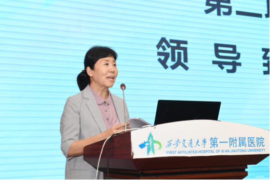 赵岚副主任代表陕西省卫生健康委向一附院全院医生致以节日的祝贺。她说到,近年来一附院积极响应国家医改政策、科学规划创新医疗服务模式,不断探索医院管理新思路,全面推进一院多区发展战略,打造“三院四区”的发展格局,以创建国家医学中心为引领,聚焦人民健康重大需求,在人才培养、技术攻关、临床成果转化等方面步入发展快车道,形成具有一附院特色的高质量发展路径。希望一附院广大医师与医务工作者继续大力弘扬“敬佑生命、救死扶伤、甘于奉献、大爱无疆”的崇高精神,把个人的理想追求融入党和国家的卫生健康事业之中,为推进健康中国建设、保障人民健康再立新功。