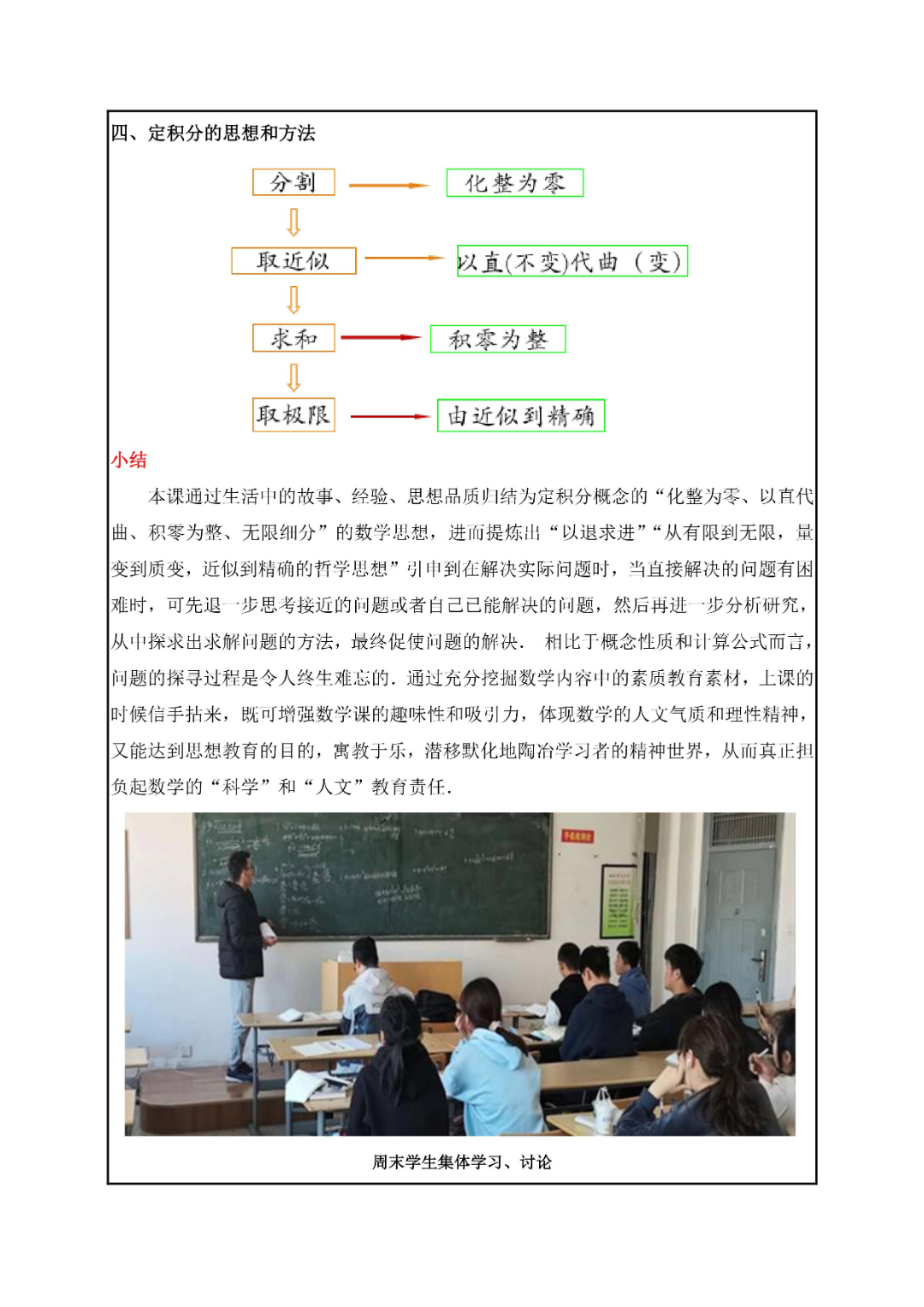 课程团队用习近平新时代中国特色社会主义思想中蕴含的立场、观点和方法分析解决问题,增强课堂吸引力,提高课堂教与学的质量。强化课程思政教学设计,开展集体备课,探索各门课程之间和概率统计课程之间的内容衔接。创新教学方法与艺术,实施专题化与慕课相结合的线上线下混合式教学模式。加强对教案编写、课件制作、课堂教学组织形式研究,形成了一批精彩教案、精彩课件、精彩微课。