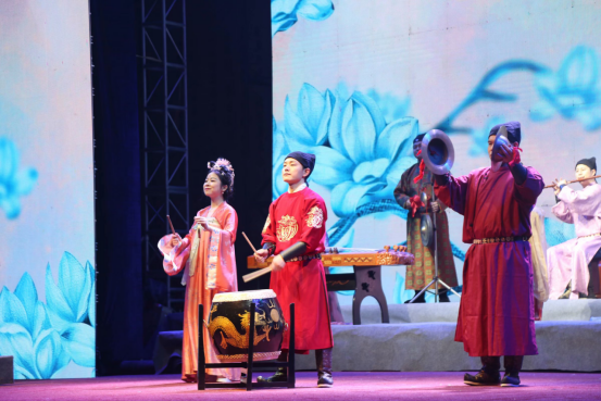 西安外事古乐团“钟鸣鼓乐”演出在继承世界非物质文化遗产“西安鼓乐”核心特质的同时,从立意、编曲、造型、舞美等方面进行大胆创新,古为今用、推陈出新,让“非遗”“活起来”。