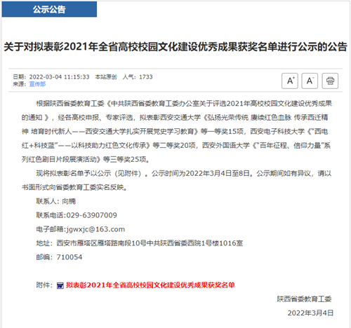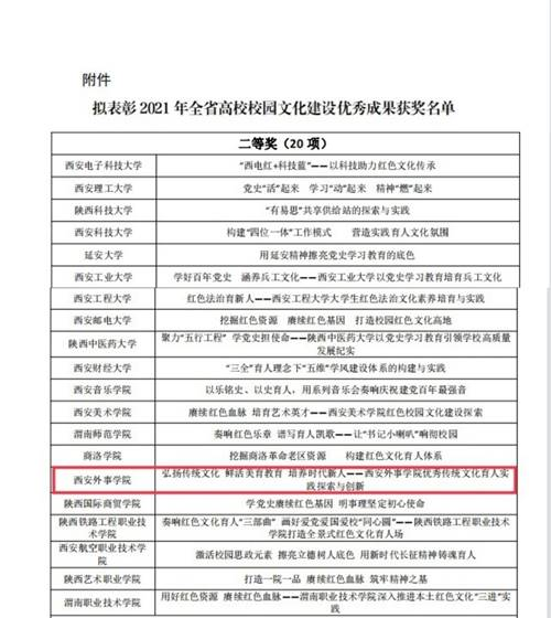 近日,陕西省委教育工委发布了《中共陕西省委教育工委办公室关于评选2021年高校校园文化建设优秀成果的通知》,由西安外事学院团委组织申报的《弘扬传统文化鲜活美育教育 培养时代新人——西安外事学院优秀传统文化育人实践探索与创新》荣获二等奖。