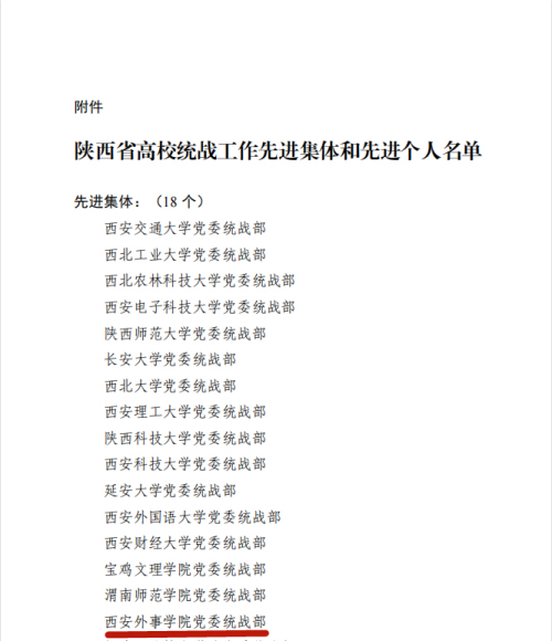近日,中共陕西省委教育工委通报表彰了2019—2021年度陕西省高校统战工作先进集体、先进个人,西安外事学院党委统战部获评陕西省高校统战工作先进集体。西安外事学院是本次评选中唯一受表彰的民办高校。