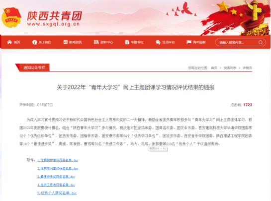 据悉,本次评优根据2022年度数据统计排名,结合“陕西青年大学习”参与情况,在全省共表彰“优秀组织单位”32个,“先进工作者”70名,“优秀个人”210名。