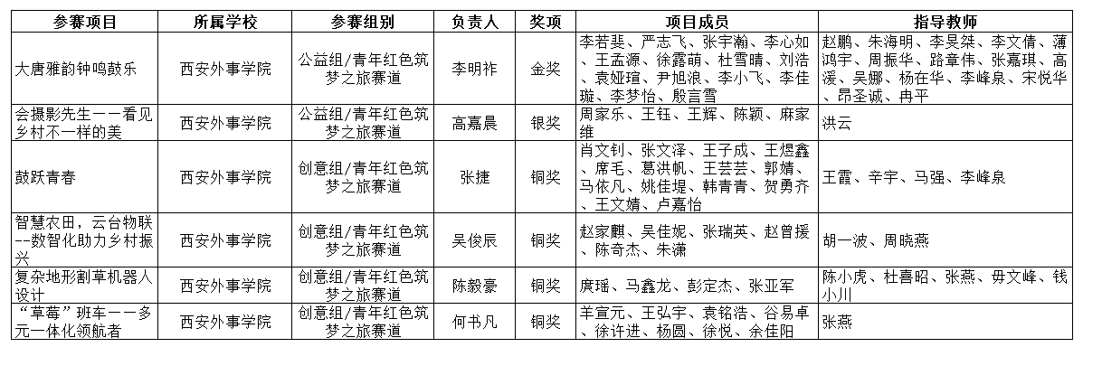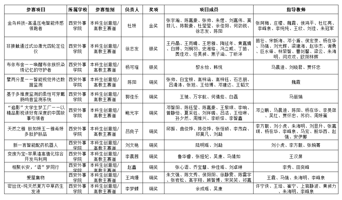 2023年8月初,第九届中国国际“互联网+”大学生创新创业大赛陕西赛区决赛在西北工业大学长安校区落下帷幕。经过激烈角逐,我校共获得金奖2项、银奖3项,铜奖16项。令人鼓舞的是,在现场比赛中,西安外事学院“大唐雅韵▪钟鸣鼓乐”、“金乌科技——高温压电传感技术的领跑者”项目分别从教育维度、创新维度、商业维度、团队维度、社会价值维度等方面通过项目路演、评委提问等环节进行展示,分别荣获“青年红色筑梦之旅创意组”和“高教主赛道本科生创意组”金奖,这是我校在“互联网+”创新创业大赛中最好成绩。