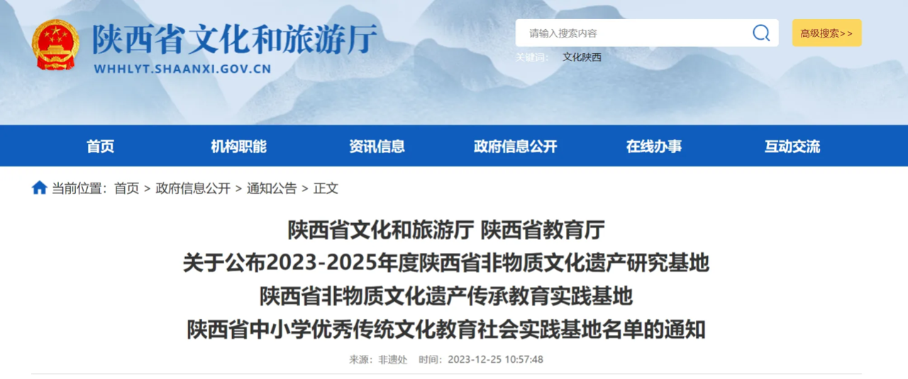 2023年12月25日,经申报、评审、公示等程序,陕西省文化和旅游厅、陕西省教育厅决定,命名19家单位获评为2023-2025年度陕西省非物质文化遗产研究基地。西安外事学院申报的《西安鼓乐非遗文化研究基地》项目成功获批,实现了西安外事学院在非遗文化传承与保护、传统文化教育工作中的又一突破。