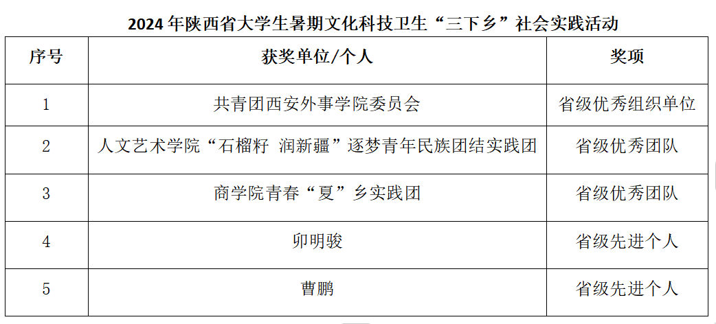 西安外事学院在陕西省大学生暑期文化科技卫生“三下乡”社会实践活动中荣获多个奖项