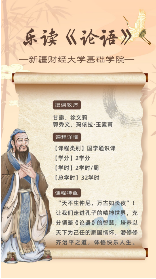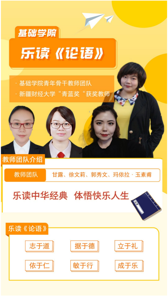 《乐读 <论语> 》课程团队教师均为新疆财经大学基础学院的青年骨干教师,长期从事中华传统文化教育教学和研究工作,多次参与组织学院中华传统文化艺术节系列活动,发挥了中华优秀传统文化对青年学子的引领作用,展示了青年学子的风采,增强了大学生的综合素质。 论语>
