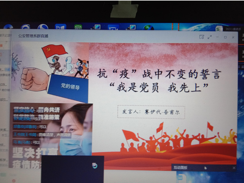 为扎实推进公安管理系党支部“党建引领疫情防控”工作,更好地发挥党员的先锋模范作用,公安管理系党支部在疫情防控期间推出系列微党课活动。2月28日、3月6日下午,公安管理系支部利用“钉钉”群直播方式开展了三人次微党课活动和疫情防控工作主题党日活动。会议由支部书记王亚宁同志主持,支部全体党员参加。