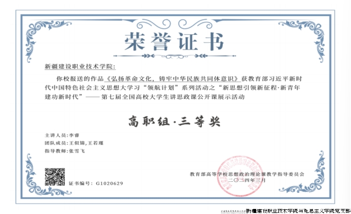 近日,教育部公布了习近平新时代中国特色社会主义思想大学生“领航计划”系列活动之“新思想引领新征程·新青年建功新时代”第七届全国高校大学生讲思政课公开课展示活动获奖作品名单。我校马克思主义学院张雪飞老师指导,学生团队工程管理学院学生李睿、王似锦、王若瑾共同完成的大学生讲思政课作品《弘扬革命文化,铸牢中华民族共同体意识》喜获全国高职组三等奖荣誉。
