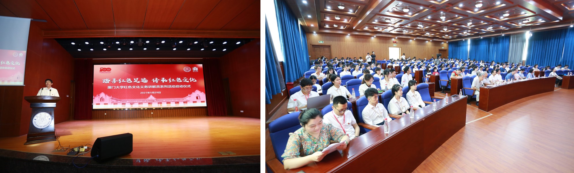 5月29日上午,“踏寻红色足迹 传承红色文化”厦门大学红色文化义务讲解员系列活动启动仪式暨岗前培训会在法学院模拟法庭举行。厦门大学党委副书记徐进功,厦门日报社党委副书记、总编辑蔡廷谦,市委党史和地方志研究室副主任樊荣兵等领导嘉宾出席活动。
