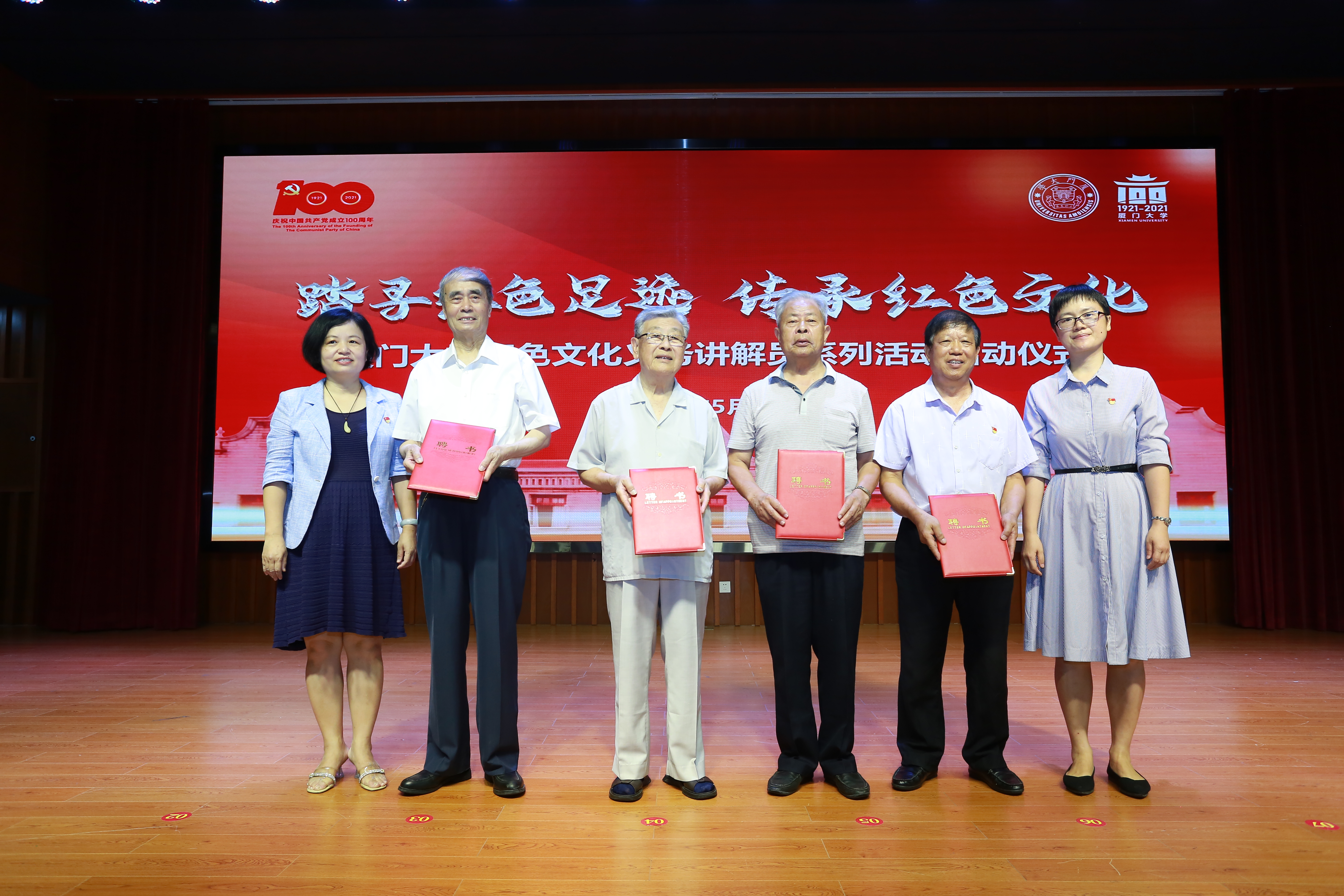 徐进功,蔡廷谦,樊荣兵,厦门日报社编委、专副刊中心主任廖慧娟,厦门大学党委学生工作部部长李峰,厦门大学团委书记曾铮,厦门大学党委宣传部副部长洪春生,厦门大学信息学院党委副书记龙坚毅共同启动“踏寻红色足迹 传承红色文化”厦门大学红色文化义务讲解系列活动。