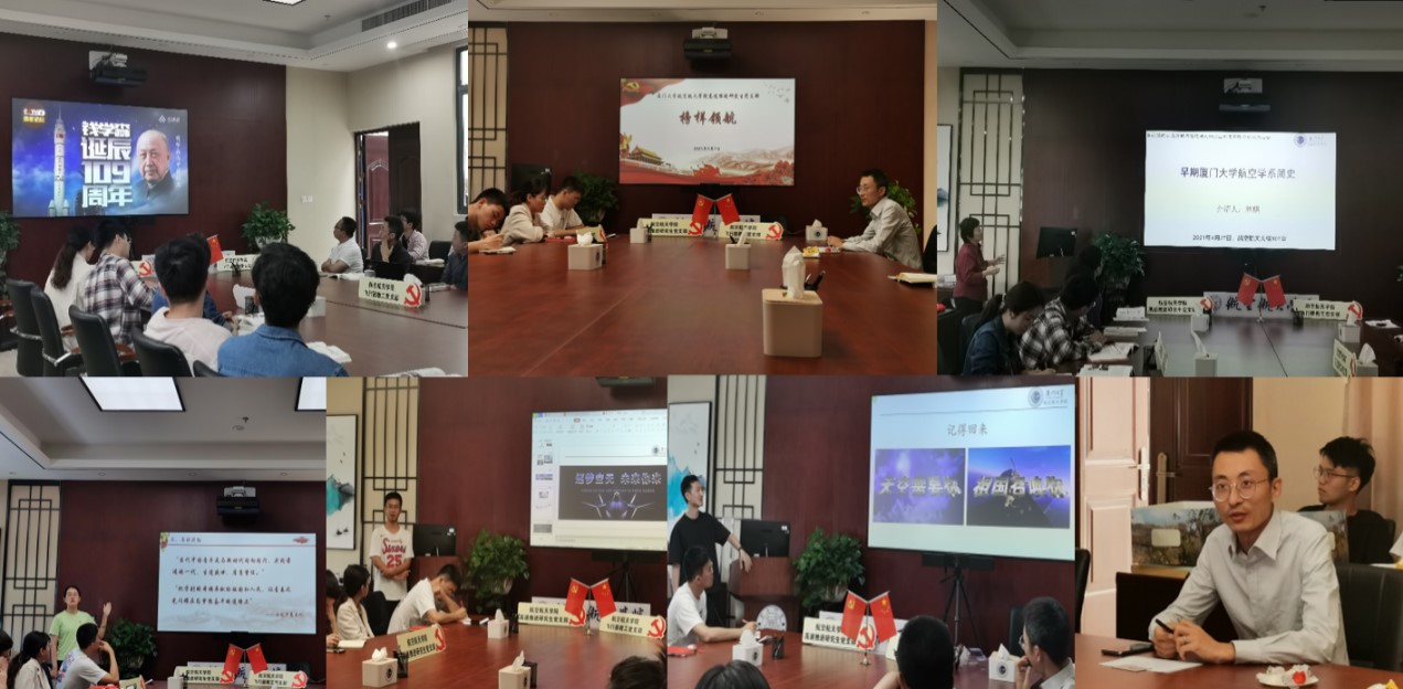 在党史学习教育中厚植“空天报国”精神,通过资深教师党员讲授、优秀学生党员分享的方式,传承英雄事迹、彰显榜样力量。举办“榜样导航”系列“固定党日+”活动,有关于以钱学森先生为代表的具有“爱国、求实、创新、奉献”精神的一批空天领域科学家们的纪录片观影、讨论;有教工支部林麒教授开讲“厦门大学航空学系简史”,动情介绍了王克铭、彭腾云等一批早期厦大航空系学生积极参加中国共产党“地下活动”的英雄事迹,以及陈一坚院士等杰出院友投身航空、矢志报国的励志故事;还有以“身边的师生榜样”为专题,由曲文慧、施崇广、刘宗阳三位学生党员分别作为重点行业就业代表、科研攻关代表、社会工作代表,分享奋进自强的生动经历,教工支部组织委员朱呈祥副教授结合自身科研报国的感悟进行总结提升。“榜样导航”系列活动将师生党支部的智慧共享、经历互通,在强化榜样作用的同时增进了对航空航天事业的专业共信与情感共鸣,有利于两支部结合学科优势进一步发挥战斗堡垒和党员先锋模范作用。
