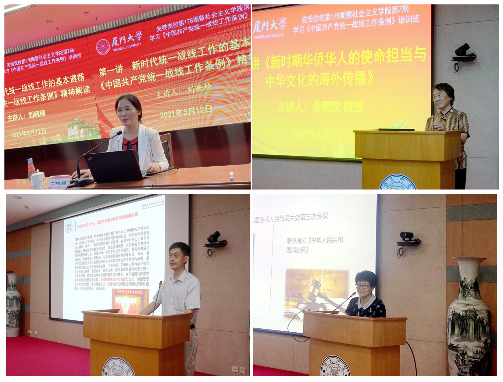 在此次实践教学前,培训班还在校内举办了四场专题讲座,既深入开展党史学习教育,又深入掌握《条例》精神实质,分别邀请福建省社会主义学院刘晓楠教授作《新时代统一战线工作的基本遵循—— <中国共产党统一战线工作条例> 精神解读》报告、厦门大学公共事务学院李明欢教授作题为《新时期华侨华人的使命担当与中华文化的海外传播》报告、厦门大学马克思主义学院张有奎教授作题为《旗帜鲜明反对历史虚无主义》报告、福建师范大学协和学院杨林香教授作题为《意识形态领域突出热点与建设引领解析》报告。 中国共产党统一战线工作条例>