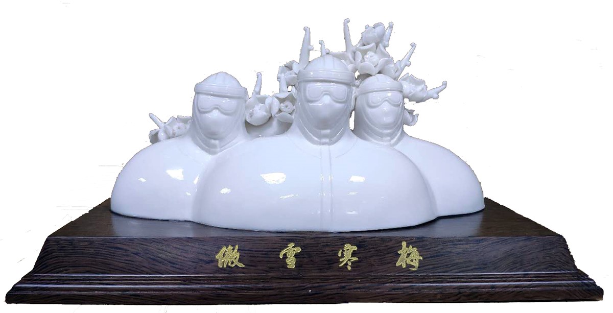 为表达对英雄的崇高敬意,学校为每位抗疫英雄特别设计制作了《傲雪寒梅》纪念雕塑。雕塑以德化白瓷制成,身着防护服、佩戴护目镜的医护人员和其身后怒放的梅花相互辉映,象征着广大医护人员在病毒肆虐之时挺身而出、为爱逆行,与疫病搏斗,用精湛的医术、深厚的爱心与人民一道迎接春天的到来。每尊雕塑都刻着英雄的名字。雕塑由我校艺术学院常务副院长吴荣华设计创作。