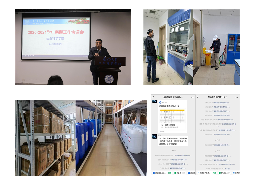 生命科学学院始终把守护师生生命安全和身体健康放在第一位,严格落实学校疫情防控工作的各项部署要求,毫不放松抓好寒假期间学院疫情防控各项工作,逐级压实疫情防控责任,切实维护学院安全稳定,全力保障留校学生正常科研、实验、学习条件,让学生安心、让家长放心。提前部署统筹防疫,1月5日召开寒假安全保障工作协调会,制定寒假留校学生安全防控预案,做好各类疫情防控、安全相关物资的盘点和储备工作,保证假期实验室物资供应,落实假期安全和后勤保障人员值班制度,确保实验平台正常运转。召开留校学生安全教育大会,强调假期疫情防控、网络、交通、宿舍、实验、防诈骗等各项安全注意事项,确保学生人身财产安全。建立学生动态管理体系,对留校学生实施网格化管理,由课题组安全员对学生动态进行每日一报,结合学生健康打卡情况动态设置入院权限,精准掌握每日离返厦学生人数,密切关注学生动态。实验室安全巡查常态化,成立安全检查小组,组织人员实施每日实验室安全巡查,建立巡查台账,限时整改隐患,落实闭环管理,保障寒假期间各项工作顺利开展。