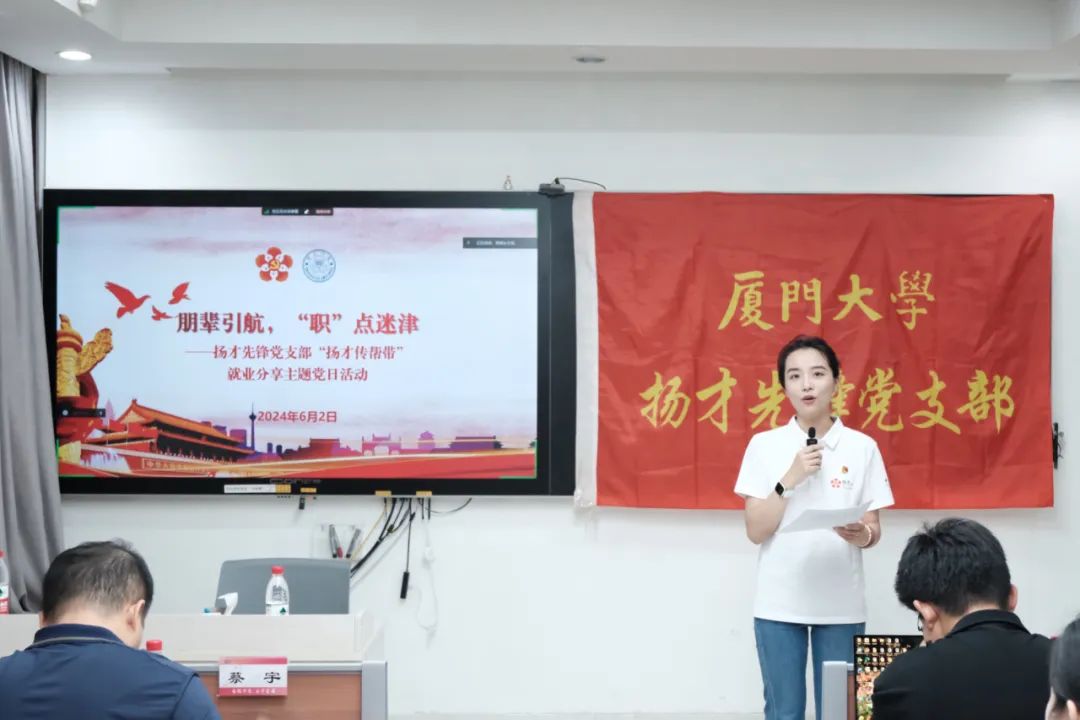高擎引航之灯,照亮就业之路。为帮助“小扬才”认清择业形势、规划职业航向、提升就业竞争力,进一步加强“扬才”大家庭之间的沟通交流,6月2日,扬才先锋党支部以线上线下相结合的方式举办了“朋辈引航,‘职’点迷津”——“扬才传帮带”就业分享主题党日活动。本次活动邀请到学校外文学院团委副书记、国家二级职业指导师蔡宇开展就业指导专题讲座,同时邀请到多位往期“扬才班”学员分享备考经验和工作心得。