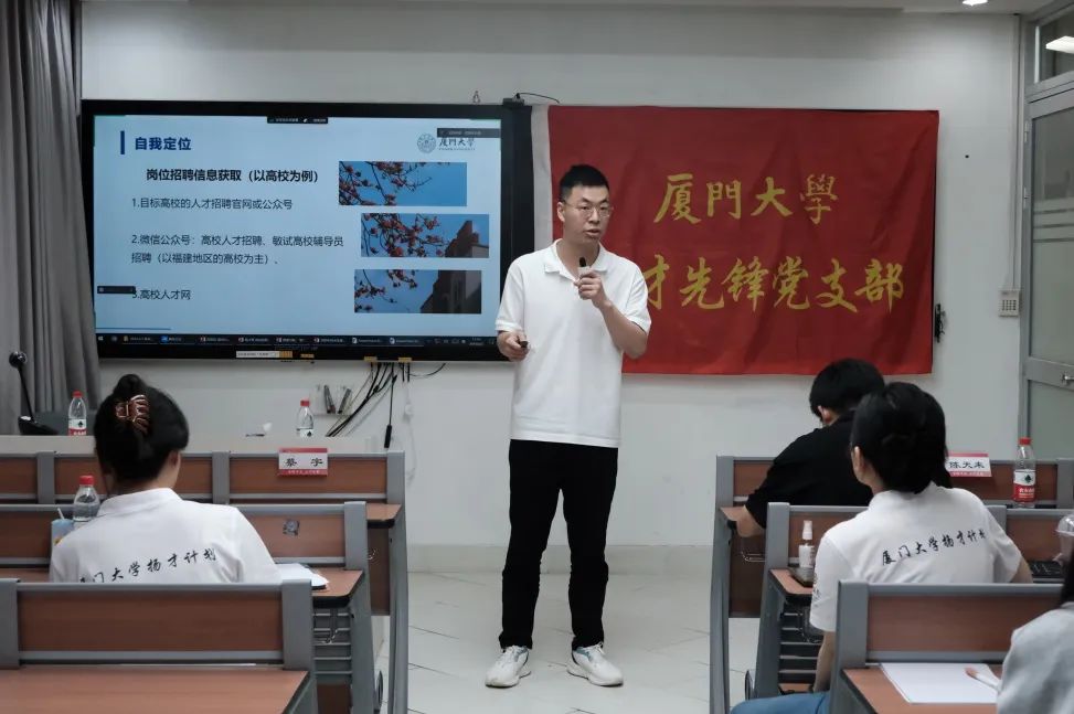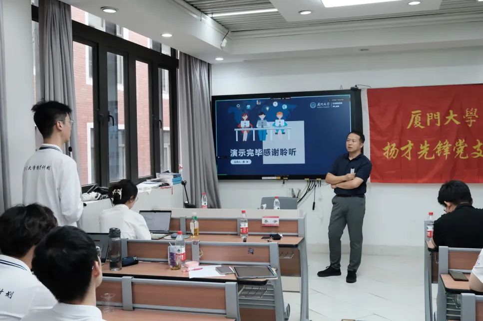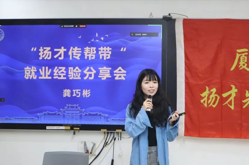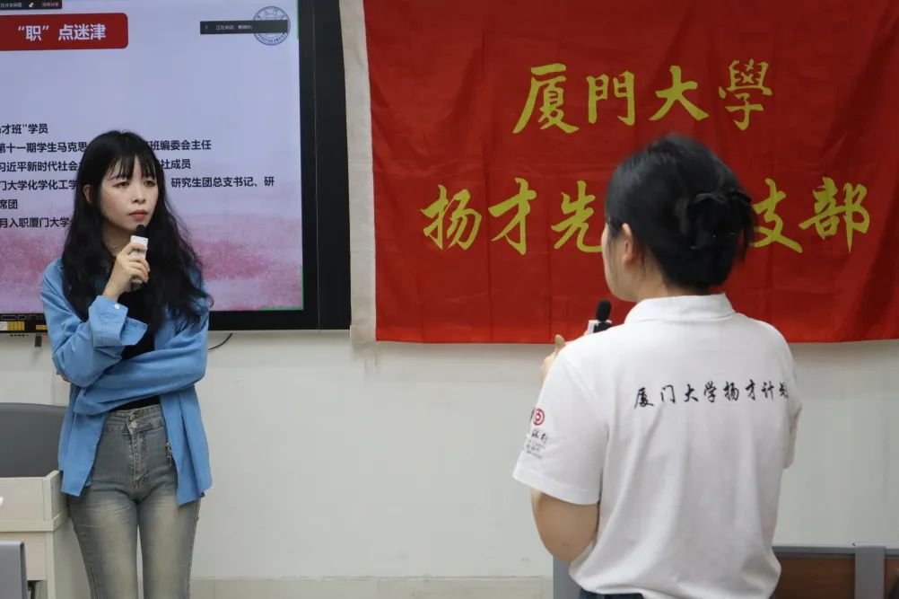 第四期“扬才班”学员、2023届化学化工学院硕士研究生龚巧彬现为厦门大学化学化工学院辅导员。她以生动的案例介绍了辅导员的工作内容,并结合学生时代的工作经验,畅谈了在学生日常管理、心理建设及帮助学生全面发展等方面的有益尝试。她表示,作为一名高校辅导员,很开心能够在落实立德树人根本任务、积极承担青春引路人使命的同时,在与学生的朝夕相处中,不断收获成就感和幸福感、实现人生价值。她勉励“小扬才”们积极参与学生工作、积累宝贵经验,在实践中磨砺本领、增长才干、走在前列、绽放青春。