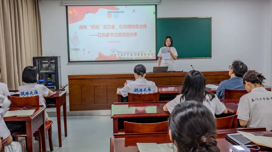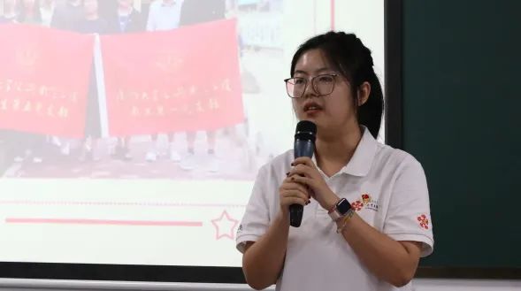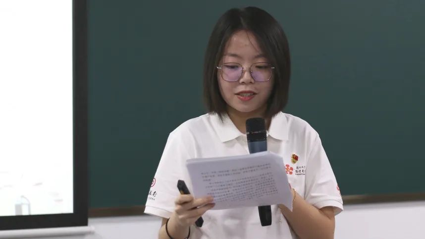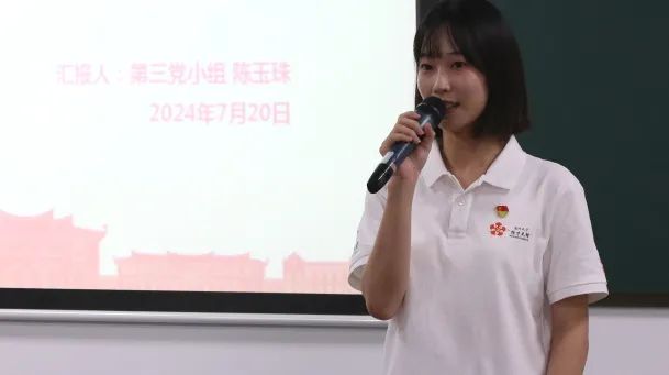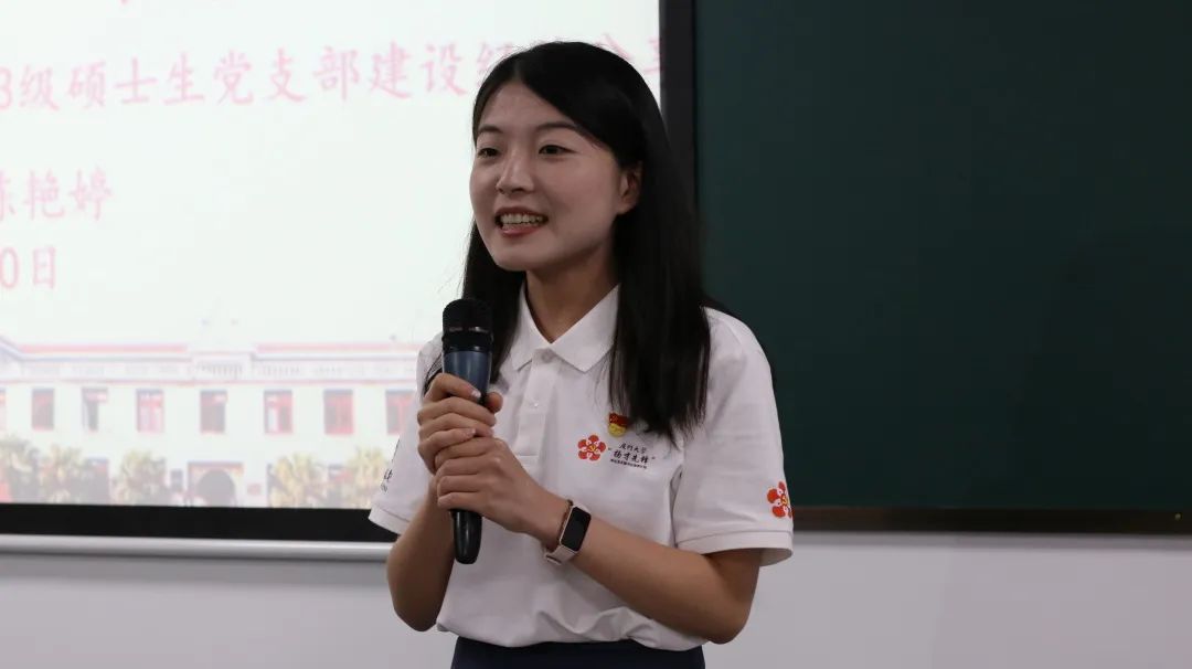 第六期“扬才班”学员、中国语言文学系2021级本科生林初晴分享了党支部工作“立项活动”优秀成果《“闽南‘侨批’抵万金,红色精神亘古传”——厦大社区家书故事讲述》的工作经验。她强调,支部要充分利用学校和周边社区紧密联系的优势,将支部立项活动与入党申请人、入党积极分子、预备党员和正式党员的培养工作相结合,通过重温党史,强化党员的党性意识和责任担当,不断提升支部党员为社会服务的能力和本领。