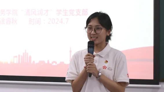 第六期“扬才班”学员、公共事务学院2023级硕士生徐睿秋以《“清风润厦廉花开”——廉政教育主题党课助力廉洁校园建设》为题分享了支部开展党纪学习教育的好经验、好做法。支部推出廉政教育主题党课,精心打磨“清风润心”理论学习课、“清风修心”实践感悟课、“清风立心”专业研讨课、“清风正心”毕业教育课,将廉洁教育理论知识转化为培养人、教育人、引领人的精神力量,在校园扬起一股“清廉之风”,助力廉洁校园建设。