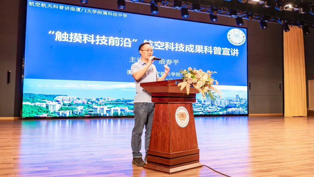 在“触摸科技前沿”环节,殷春平作为科创先锋党支部的红色导师,为同学们带来了航空科技成果科普宣讲。他以厦门大学航空航天学院创新研制、成功发射“本栋”系列火箭的纪实视频引入,用通俗易懂、妙趣横生的语言分享了厦大青年学子在科技创新、成果转化方面的最近进展,带领大家体验科技前沿脉搏,感受空天科技魅力。
