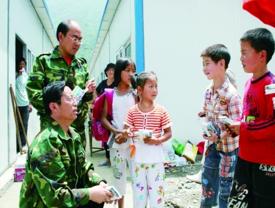 2008年“六一”儿童节当天,援川干部在北川县桂溪乡看望受灾儿童。新华社发