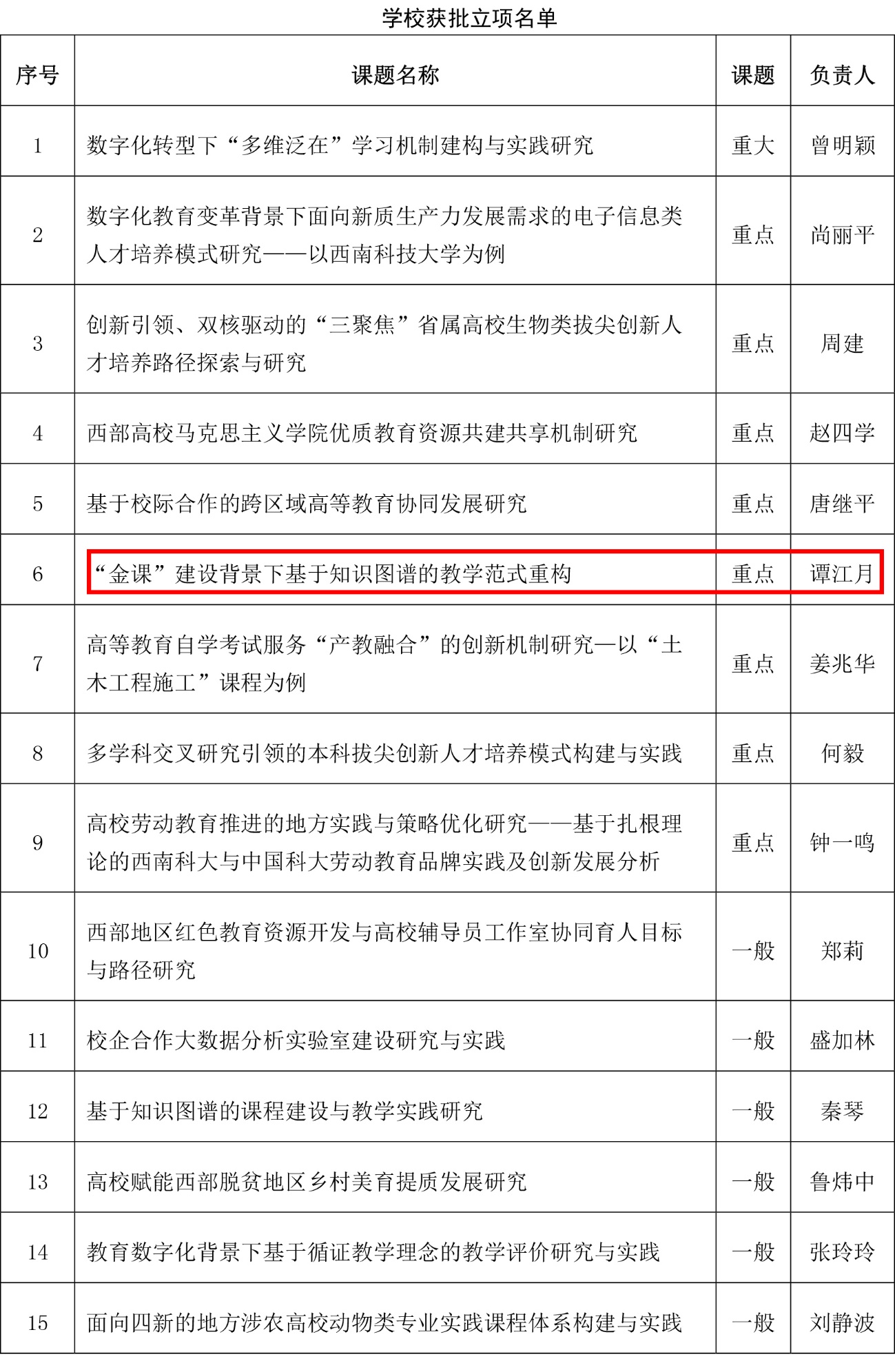 近日,中国高等教育学会发布“2024年度高等教育科学研究规划课题”立项名单,我校15项课题获批立项,其中我院环境工程系谭江月老师申请的重点课题(课题名称:“金课”建设背景下基于知识图谱的教学范式重构)获批立项。