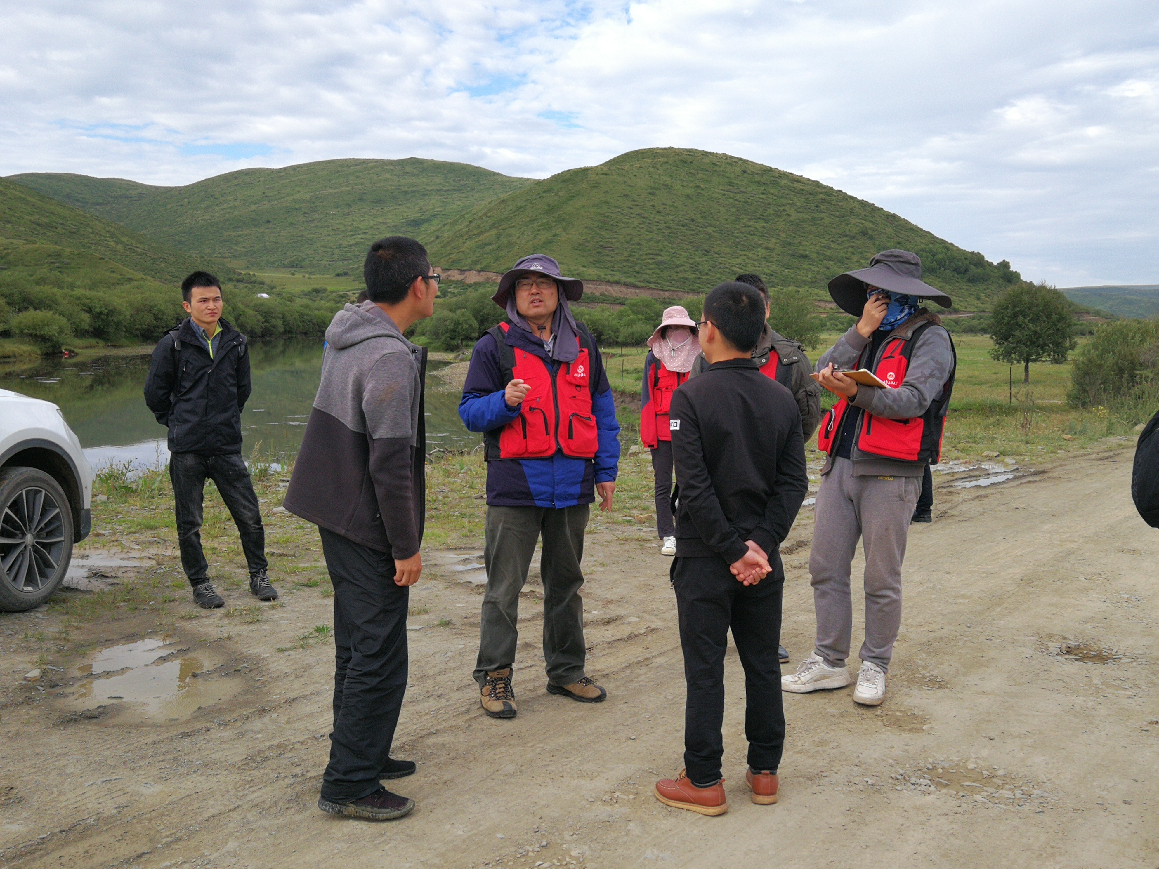 王长庭(左三)与草原站技术员一起研讨草地资源调查情况。受访者供图