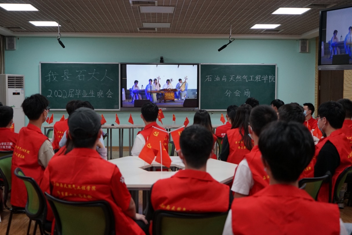 看一场毕业生晚会。“我是石大人”2022届毕业生晚会如期举行,在常态化疫情防控形势下,党支部组织毕业生党员在明理楼C1204通过飞书平台进行观看,全程佩戴口罩,切实做好疫情防范工作。石工院表演的《山河图》为我们展现了祖国大好河山以及川剧的魅力,希望学子在学习知识的同时,也不忘传承源远流长的艺术瑰宝。