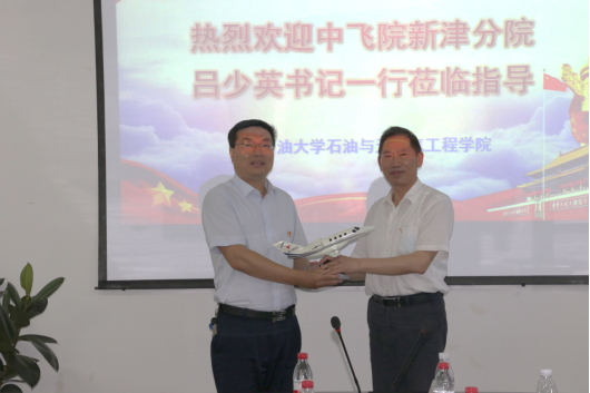 在明辨楼B519会议室,姚利代表石工院党委致欢迎辞,并对学院党建工作整体概况进行了详细介绍,重点介绍了党支部书记人员的选优配强、党建工作的多元投入、创新性党建工作的开展等经验。吕少英介绍了中飞院新津分院党建工作情况,作为“飞行人员的摇篮”,结合学生特点推动党建工作发展。朱红钧在会上介绍海洋油气工程研究所党支部的基本情况,他从海洋油气专业背景介绍切入,阐释了支部工作法的内涵、分享了支部工作法相关措施及成效,强调发挥“双带头人”作用,一体化推进党建、思政和科研教学深度融合。双方代表就党建工作进行深入交流,并围绕党建引领教学、科研分享了各自的经验和做法。吕少英表示,石工院站位高、格局远、有情怀,其党建经验是可借鉴、可参考、可复制的典范,下一步将充分借鉴、认真吸取兄弟单位党建先进经验,找准差距,补齐短板,积极推动基层党建工作再上新台阶,并代表中国民用航空飞行学院新津分院赠送了一架教学训练飞机模型。
