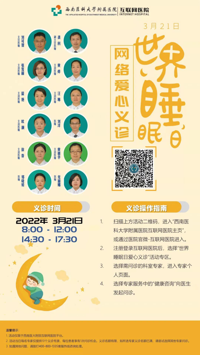 3月21日,我科12名专家通过西南医科大学附属医院互联网医院平台在网上义诊,为广大存在睡眠问题的市民朋友提供免费问诊服务。对于教培从事者、医务人员、公务员、金融从业者、企业管理者等睡眠问题的高危人群,我们应该给与更多的关怀和帮助,改变其睡眠理念,重新塑造睡眠与工作平衡的生活观,做更健康的自己。第十一党支部将继续秉承“不忘初心,牢记使命”,以党建引领学科发展,立足专业,为人民的心身健康贡献力量!
