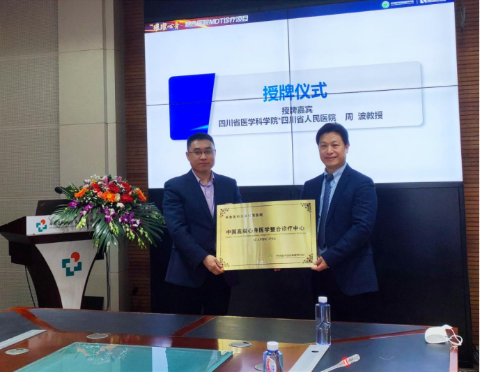 为提高我国医疗机构对心身相关障碍的诊疗水平,推动心身医学中心标准化建设进展,中华医学会心身医学分会于2022年7月-9月在全国范围内开启了第二批“心身医学整合诊疗中心”申报工作。在经历医疗机构自由申报、形式筛选及多轮复合评审等环节。在2022年11月12日,中华医学会第28届心身医学分会年会上正式发布,西南医科大学附属医院被认证为“高级心身医学整合诊疗中心”。2023年3月5日,高级心身医学科诊疗中心授牌仪式在西南医科大学附属医院外科大楼会议室举行,同时开展MDT病例讨论学术活动。